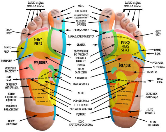Masaż ciała posiada właściwości zdrowotne i może wspomóc odchudzanie. W tym wypadku punkty te położone są oczywiście na stopach masowanego. Podczas badania receptorów wykorzystuje się technikę „spacerowania”. Wrażliwość, czy wręcz bolesność, deformacja, ziarnistość obszaru refleksyjnego sygnalizuje o istnieniu zaburzenia, niedomagania w konkretnej części ciała. Refleksoterapia pobudza oczyszczanie z toksyn i między innymi ze względu na ten fakt, istnieje prawdopodobieństwo wystąpienia charakterystycznych odpowiedzi ustroju takich jak: potliwość, uczucie ciepła, zimna lub mrowienia, suchość w gardle, katar, wzmożone oddawanie moczu, pragnienie, senność, skłonność do śmiechu lub płaczu, wzmożony bądź słabszy apetyt, a nawet krótka choroba o cechach przeziębienia.